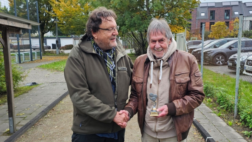 Symbol für das Boulespielen sind drei stahlgraue Kugeln, in dem Pokal ist darunter ein goldenes Schweinchen für den 1. Platz zu sehen: Hans-Georg Lindenlaub nimmt den abteilungsinernen Boule-Pokal 2025 von TVA-Boulewart Michael Schwabe entgegen (Fotos: Winfried Raffel / TVA).